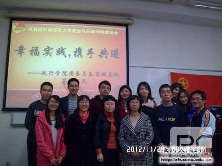 社会实践是指引大学生将知识与实际相联系的重要平台。因此,为提高我院学生实践能力和探索精神,实现参与社会实践常规化和定期化的目标,我院于11月29日在一课北306举行了我院团委与各实践基地的签约仪式。我院团委书记、10级 辅导员王鹏老师,和各实践基地负责人,分别是石牌街道办黄志清团委书记,第十六中学团委书记陈洁老师,第四十七中学团委书记刘允飞老师,第一一三中学团委 副书记林友柱老师,天河中学团委书记肖彩凤老师,南国学校团委书记孙烨老师及学生会指导老师陈玲玲老师和班主任代表卢志敏老师,华南理工大学附属小学江小 宇老师,校团委实践部部长李浩俊同学,我院团委副书记吴之声同学莅临了现场。