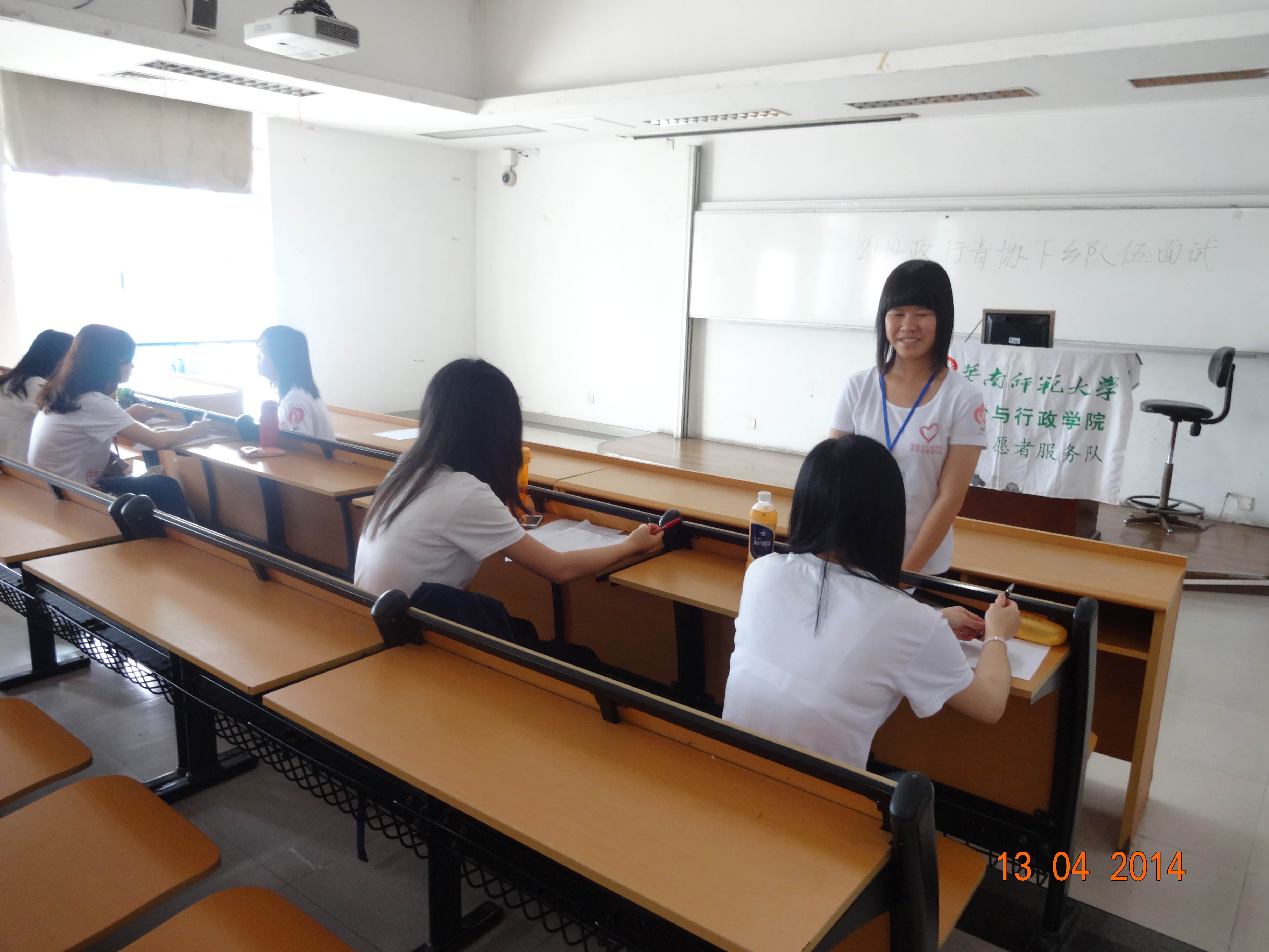 13日下午2点20分,志愿者到达面试场地做好准备工作。2点30分面试正式开始。同学们陆续到达面试地点,志愿者引导同学报名、签到、面试,整个面试过程有序地进行。面试结束后,志愿者及时发短信通知入选同学,并帮忙收拾了课室和撰写相关通讯稿。